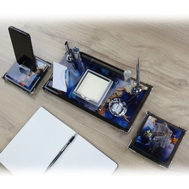 | İçerik: Kalem Seti, Telefon Standı, Küp Notluk, Notluk, Kalemlik, Kartvizitlik, Özel Lacivert Deri Kutu |