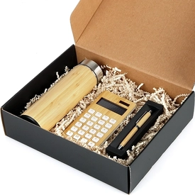 İçerik: 7148 - Bambu Termos, 1401 - Bambu Hesap Makinesi, 3302 - Bambu Kalem, KK-01 - Karton Kalem Kutusu